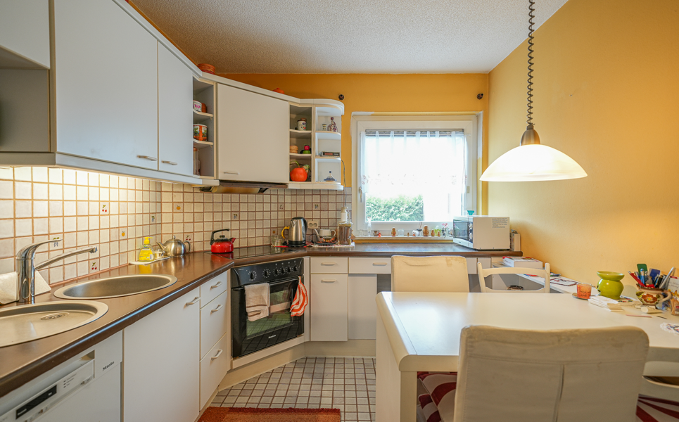Angrenzend zum Wohnraum befindet sich die ca. 9 m² Küche. Die Küche ist mit einer vollfunktionsfähigen Einbauküche und einer Sitzmöglichkeit ausgestattet.